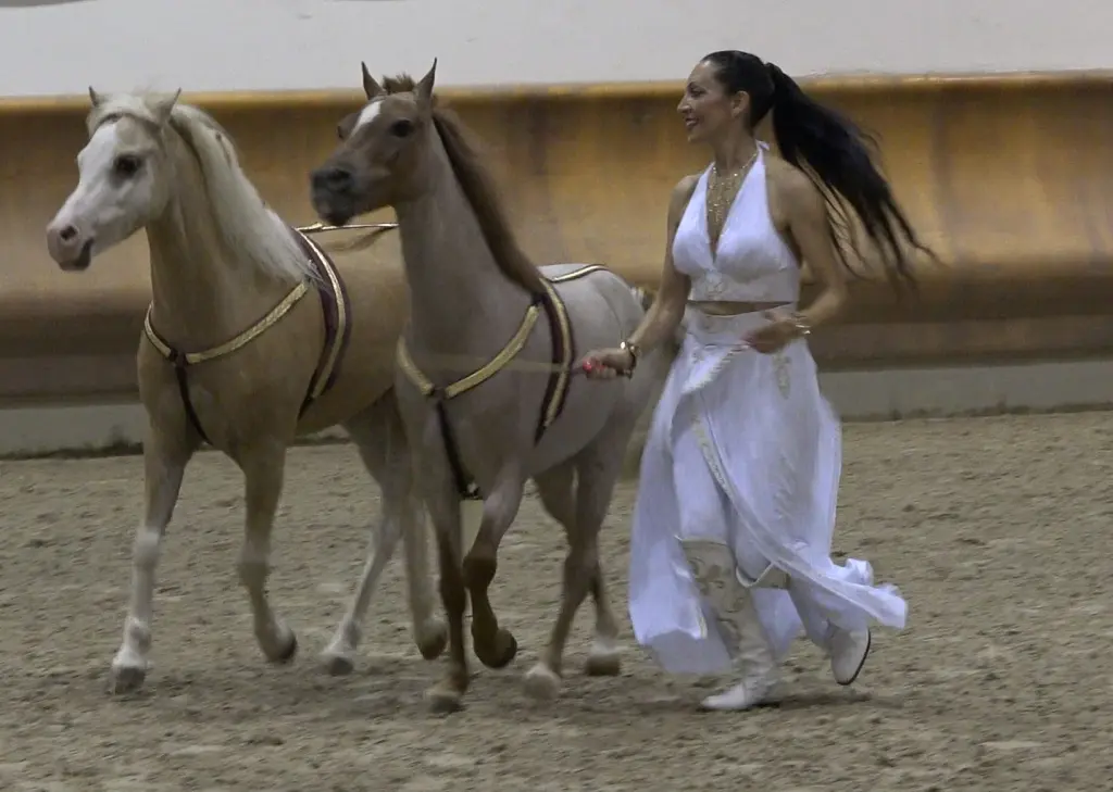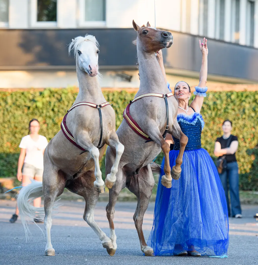 Le evoluzioni degli eleganti quadrupedi, lo straordinario connubio di equitazione ed arte inscenato da questa amazzone rappresentano i punti di forza degli spettacoli che allestisce.